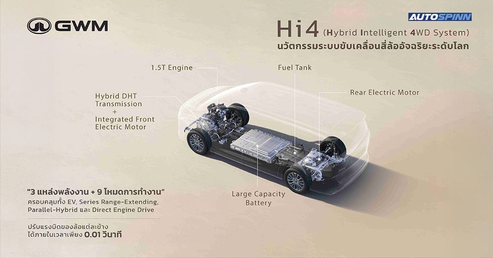 GWM WEY G9 มาพร้อม Hi4 (Hybrid Intelligent 4WD) เทคโนโลยีไฮบริดขับเคลื่อนสี่ล้ออัจฉริยะครั้งแรกของโลก หลังจากที่คว้ารางวัล Grand Prize ด้านวิทยาศาสตร์และเทคโนโลยี (S&T Award) ประจำปี 2025 จากสมาคมวิศวกรยานยนต์แห่งประเทศจีน (China SAE) ซึ่งเป็นครั้งแรกในรอบกว่า 30 ปีที่เทคโนโลยีขับเคลื่อนไฮบริดได้รับรางวัลสูงสุดนี้ และเป็นรางวัลทรงเกียรติที่สุดในอุตสาหกรรมยานยนต์จีน สะท้อนให้เห็นถึงความก้าวล้ำของเทคโนโลยี Hi4 ทั้งด้านสมรรถนะ ความปลอดภัย และความชาญฉลาดในการขับขี่ ถือเป็นความก้าวหน้าครั้งแรกของบริษัทระดับโลก เทคโนโลยี Hi4 ใช้นวัตกรรมเชิงสถาปัตยกรรม “3 แหล่งพลังงาน + 9 โหมดการทำงาน” ครอบคลุมทั้ง EV Mode, Series Range-Extending Mode, Parallel Hybrid Mode, Direct Engine Drive Mode และโหมดการฟื้นพลังงานจากทั้งเพลาหน้าและหลัง พร้อมระบบ ITVC (Intelligent Torque Vectoring Control) ที่สามารถปรับแรงบิดของล้อแต่ละข้างได้ภายในเวลาเพียง 0.01 วินาที ช่วยลดการลื่นไถลและเพิ่มการยึดเกาะบนพื้นผิวลื่น เช่น น้ำ ทราย หรือกรวด แม้แต่การเข้าโค้ง เพื่อมอบสมรรถนะการขับขี่และประสิทธิภาพที่เหนือกว่า ทั้งความเร็ว ความลื่นไหล ความเงียบ การประหยัดพลังงาน และความปลอดภัยในทุกสภาพถนน รองรับสภาพการขับขี่ที่หลากหลายในโลกแห่งการเดินทางที่ท้าทาย