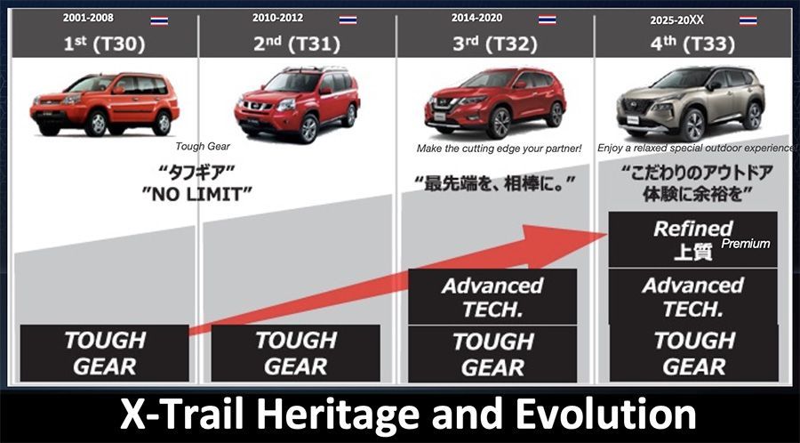 สำหรับ X-Trail เจเนอเรชันที่ 4 ซึ่งเปิดตัวตั้งแต่ปี 2020 และต้องยอมรับว่าจากรุ่นที่ 3 (T32) เปลี่ยนเป็นรุ่นที่ 4 (T33) นั้นมีความแตกต่างจากรุ่นเดิมมากๆ ซึ่งเน้น กลุ่มลูกค้าหลักมากขึ้น ทั้งในเรื่องความสบาย เพิ่มความเอนกประสงค์ โดยเพิ่มความเป็น SUV สายลุยมากยิ่งขึ้น