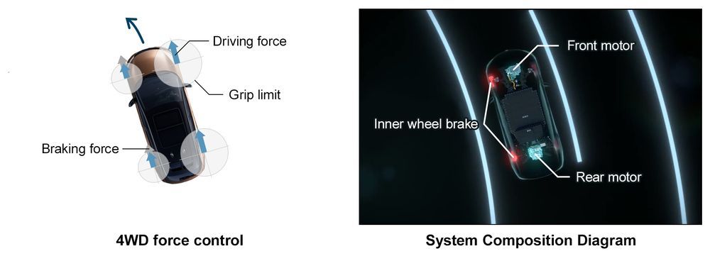 - Flat Corner Feel ลดการโยนตัวในระนาบซ้าย – ขวา ในจังหวะเข้าโค้ง ด้วยการกระจายแรงบิดแต่ละฝั่งอย่างรวดเร็ว ระดับ milli-second ทำให้ตัวรถเอียงน้อย