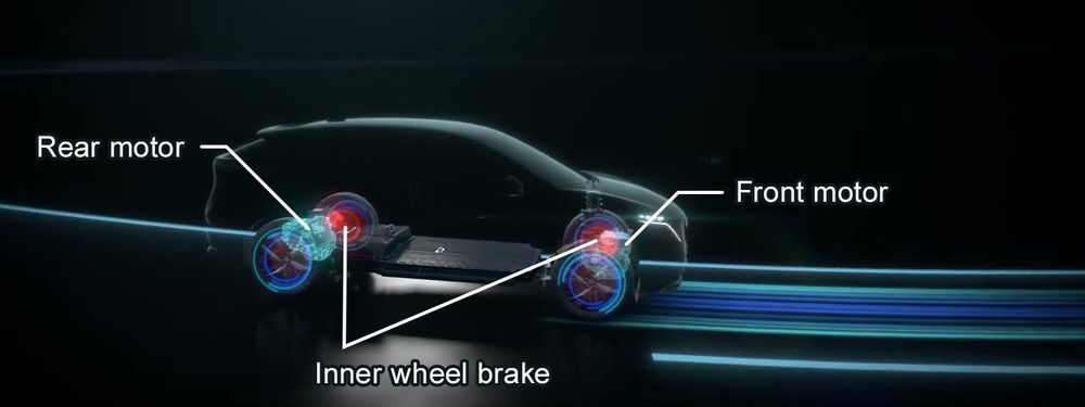 ระบบ e-4ORCE ที่เรียกได้ว่าเป็นพระเอกของรถคันนี้ เซ็นเซอร์กว่า 20 จุด เพื่อตรวจจับมุมพวงมาลัย อัตราเหยียบคันเร่ง แรง G แนวตั้ง/แนวนอน การหมุนล้อ และแรงเบรก ทั้งหมดประมวลผลผ่าน Vehicle Dynamics Controller กลาง เพื่อสั่งจ่ายแรงบิดให้เหมาะกับสภาพถนนแบบเรียลไทม์ ตัวอย่างการทำงาน เช่น ในโค้งเปียก ระบบจะลดกำลังของมอเตอร์ด้านนอกโค้ง เพิ่มด้านใน รักษาเส้นทางไม่ให้ท้ายปัด หรือบนทางลาดชัน ระบบจะใช้แรงมอเตอร์หลัง สำหรับช่วยออกตัว