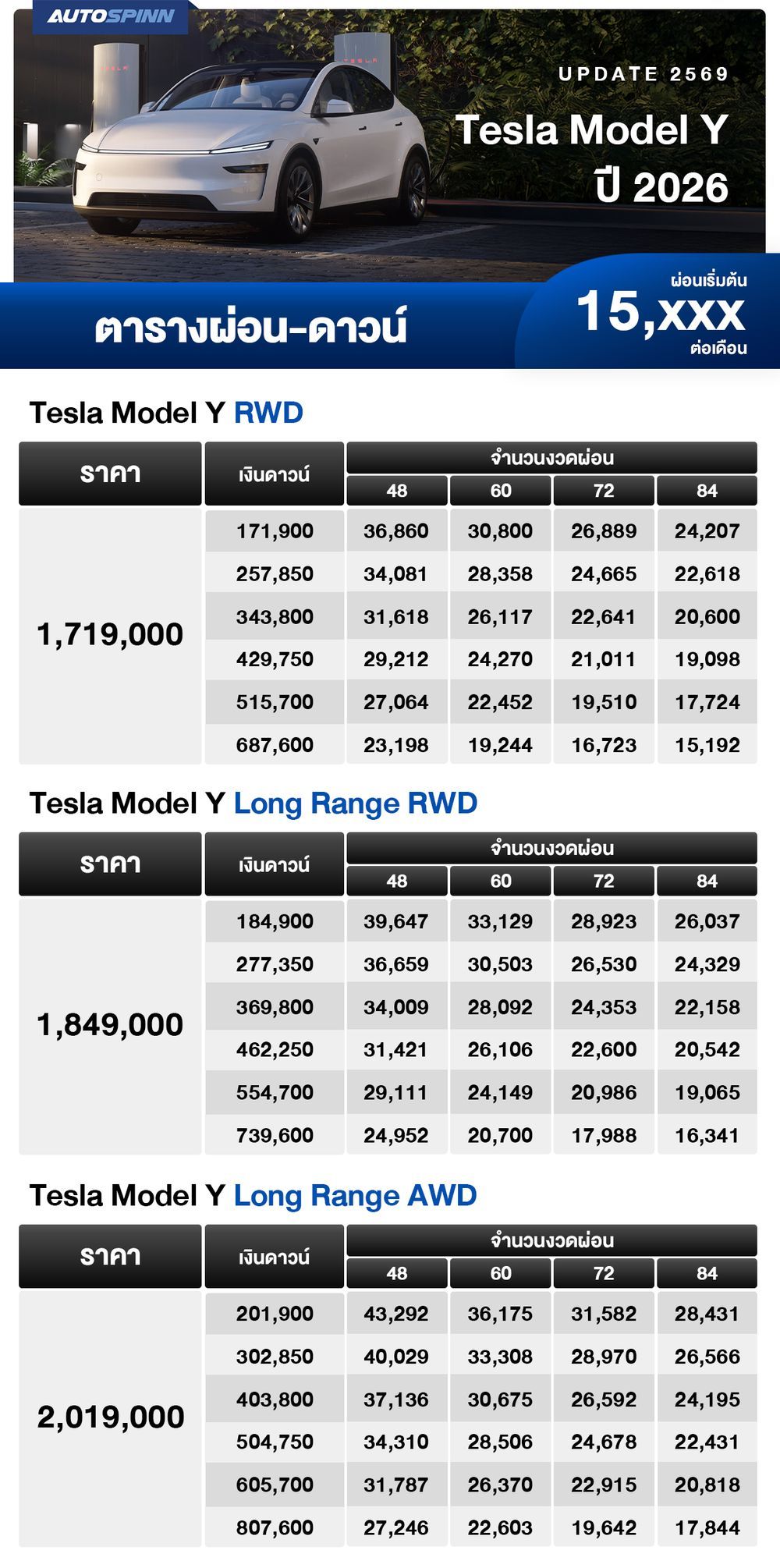 - Tesla Model Y 2025 รุ่น Long Range ขับเคลื่อนล้อหลัง ราคาเริ่มต้น 1,849,000 บาท