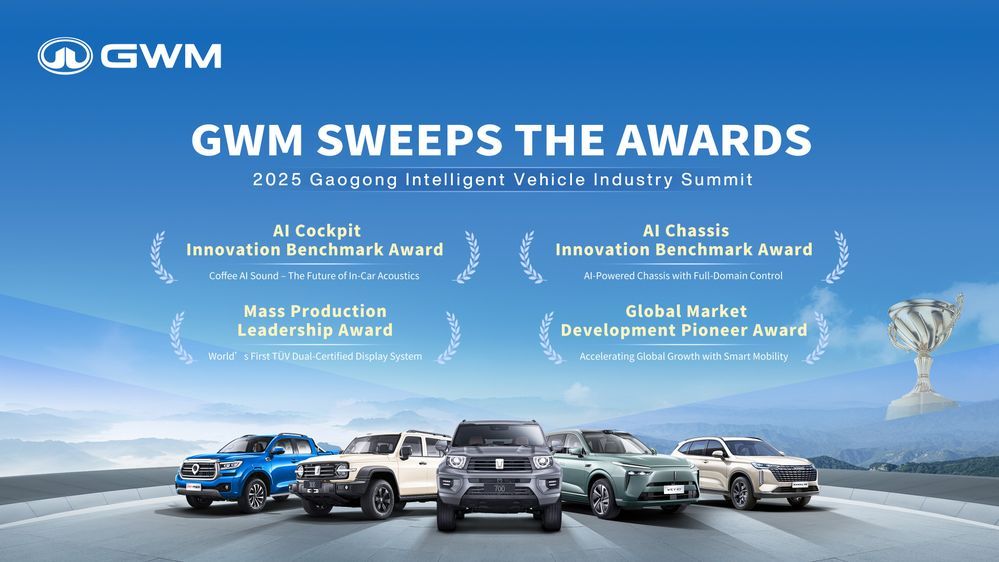 นอกจากความสำเร็จด้านยอดขาย GWM ยังคว้า 4 รางวัลอันทรงเกียรติ จากเวที “2025 Gaogong Intelligent Vehicle Industry Summit” ณ เซี่ยงไฮ้ ประเทศจีน ได้แก่ รางวัลด้านนวัตกรรมห้องโดยสารอัจฉริยะ (2025 AI Cockpit Innovation Benchmark Award), รางวัล 2025 Mass Production Leadership, รางวัล 2025 AI Chassis Innovation Benchmark และรางวัลด้านการพัฒนาระดับโลก (2025 Global Market Development Pioneer) โดยเฉพาะอย่างยิ่ง WEY G9 ที่คว้าไปถึง 2 รางวัลใหญ่ ทั้งในด้านนวัตกรรมห้องโดยสารอัจฉริยะและระบบหน้าจอที่ผ่านการรับรองมาตรฐาน TÜV สะท้อนถึงมาตรฐานใหม่ของรถหรูอัจฉริยะระดับโลก โดยรางวัลทั้ง 4 นี้สะท้อนถึงความสำเร็จแห่งปี 2568 ด้วยนวัตกรรมที่ล้ำหน้าและคุณภาพที่เหนือกว่าของรถยนต์ของ GWM ได้อย่างเต็มภาคภูมิ โดยมี WEY G9 เป็นรุ่นเรือธงในการขับเคลื่อนกลยุทธ์ระดับพรีเมียมและสร้างนิยามใหม่ ให้กับยานยนต์อัจฉริยะของโลก
