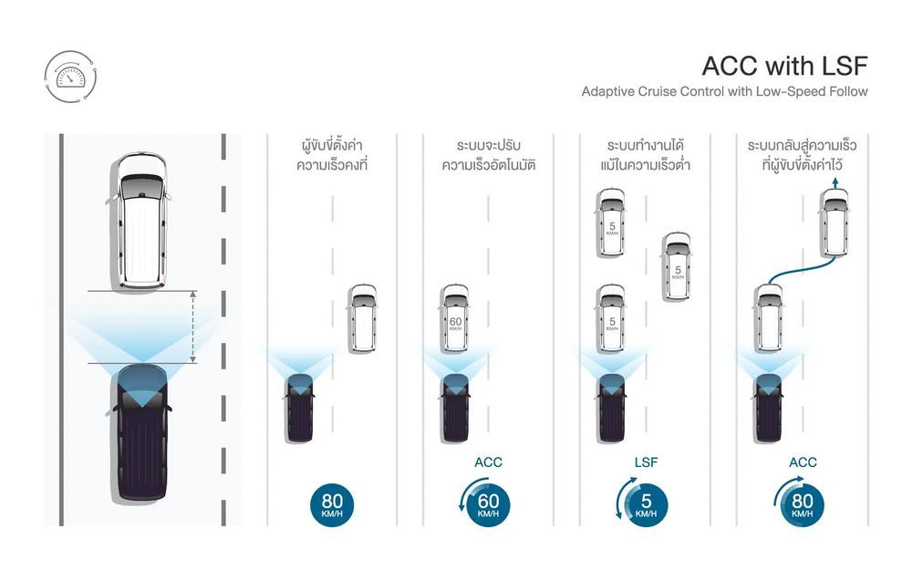 - ระบบควบคุมความเร็วอัตโนมัติแบบแปรผัน พร้อมปรับความเร็วตามคันหน้า Adaptive Cruise Control ACC with LSF Low Speed Following