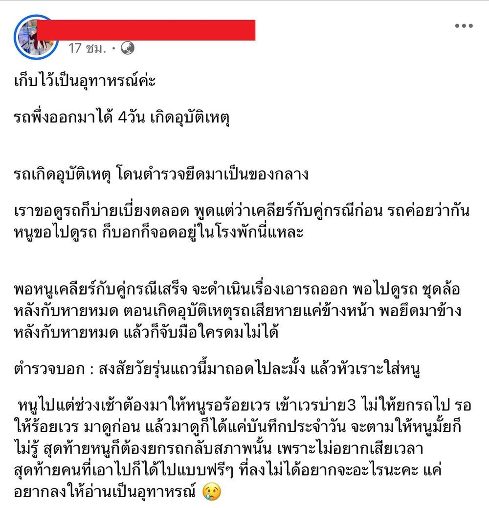 มีผู้ใช้ Facebook รายหนึ่ง ซึ่งเป็นผู้เสียหาย โพสต์ข้อความเป็นอุทาหรณ์ หลังจากที่รถเกิดอุบัติเหตุ และถูกยึดไว้ที่ สน. ปรากฎว่าอะไหล่บางส่วนถูกขโมยหายไป